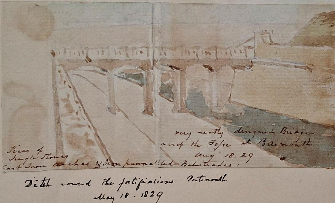 inscreibed and dated " Piers of singular storey cast iron arches and iron panelled ballustrades/ very neatly designed bridge and up the fosse Portsmouth Aug 18 1829 / Ditch around the fortifications Portsmouth May 18 1829"